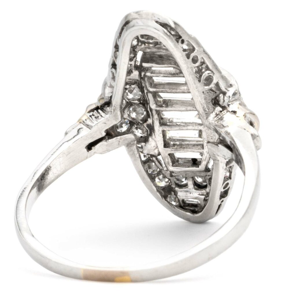 Dieser elegante Diamant-Ring im typischen Art Deco Stil besticht durch seine geometrische Form und symmetrische Linienführung. Das Hauptaugenmerk liegt auf den zentralen Diamanten im Baguette-Schliff, wie sie in der Zeit des Art Deco sehr beliebt waren, während das edle Platin das funkelnde Diamantenspiel perfekt in Szene setzt. Ein durch und durch glänzendes Schmuckstück, das die Ästhetik der 1920er und 1930er Jahre verkörpert.